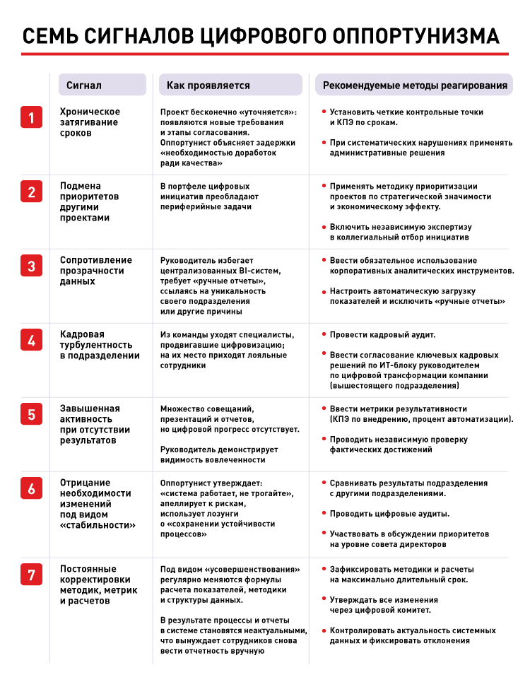 В таблице ниже приведены семь сигналов цифрового оппортунизма. Следует учитывать, что проявления цифрового оппортунизма необязательно выражаются во всех приведенных сигналах одновременно. Оппортунист не действует по шаблону, он гибок и адаптирует свое поведение под ситуацию, корпоративную культуру и уровень цифровой зрелости подразделения.