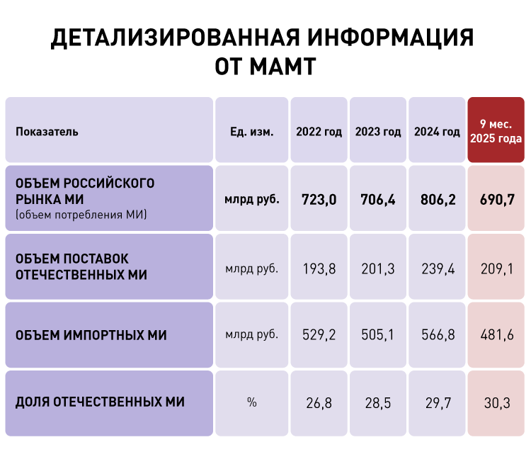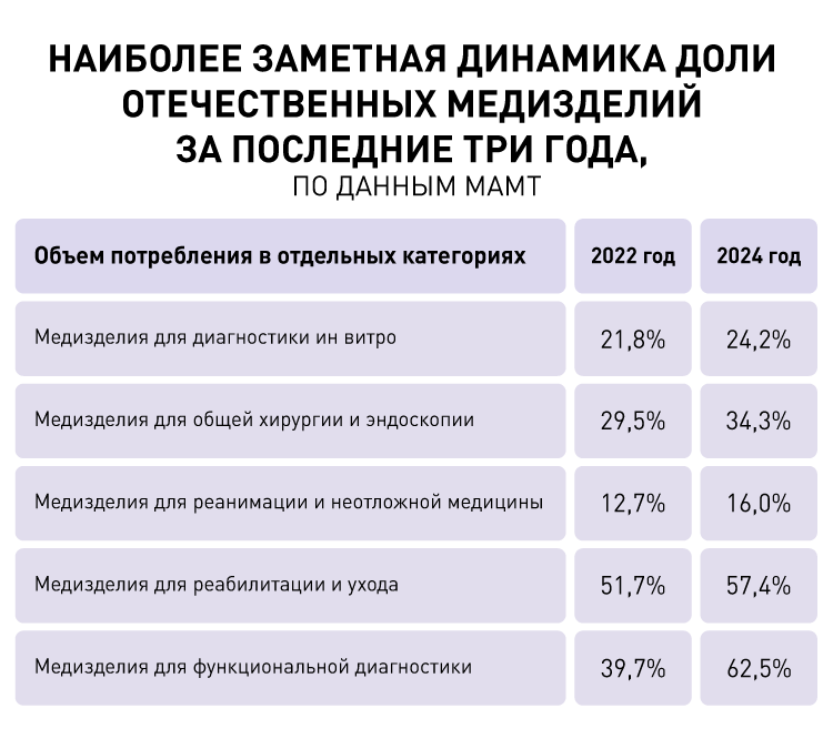 По данным МАМТ, наиболее заметная динамика доли отечественных медизделий за последние три года отмечена в следующих категориях: