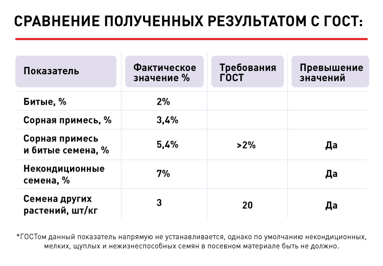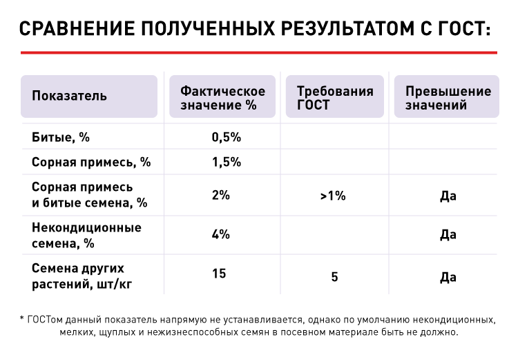 Этот минимальный набор показателей позволяет комплексно оценить качество семенного материала, выявить отклонения от требований ГОСТ и определить потенциальные риски, способные повлиять на всхожесть, урожайность и фитосанитарное состояние полей.