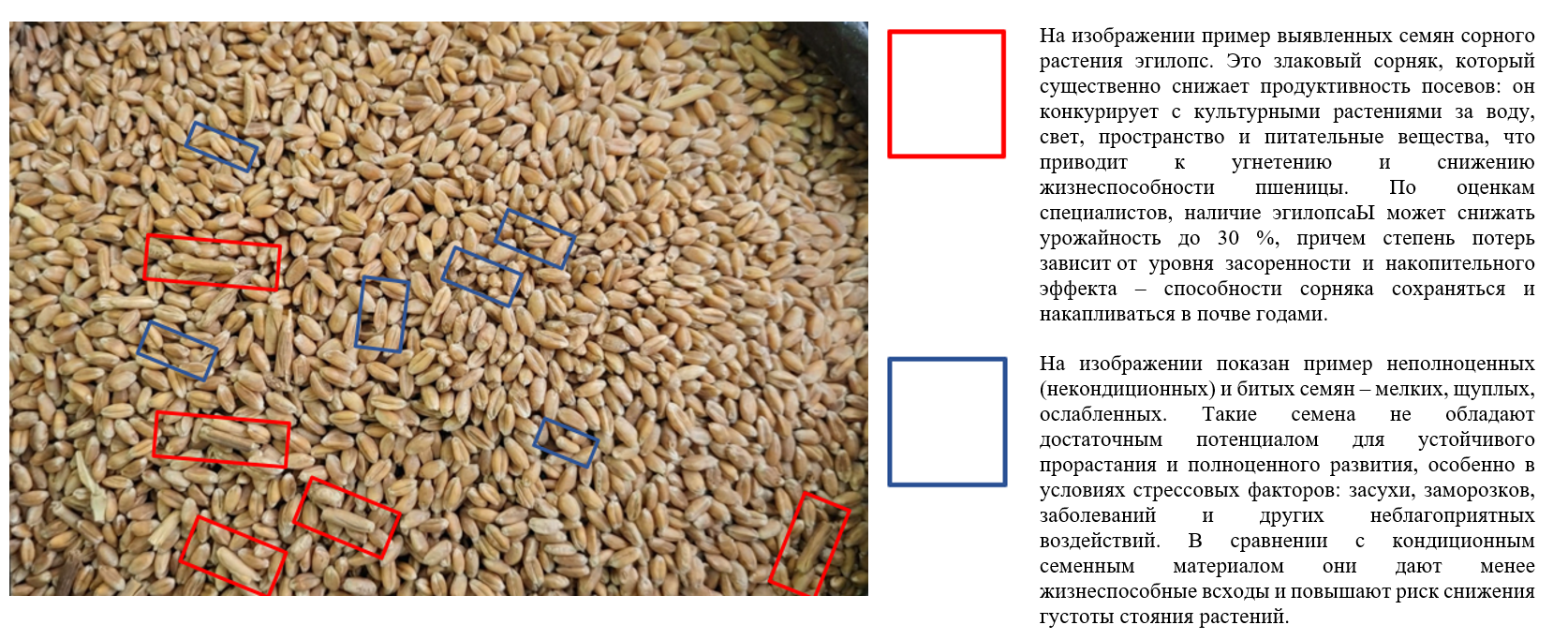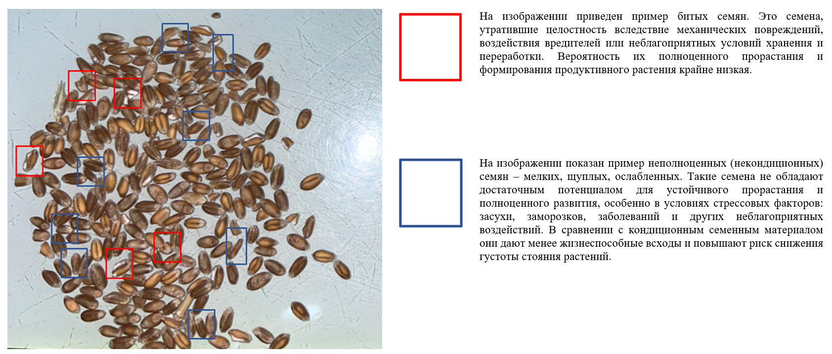 риск перерасхода семян, связанный с выявлением некондиционных и битых семян: такие партии требуют повышенной нормы высева, расхода протравителей, формируют неравномерные всходы и могут приводить к снижению продуктивности.