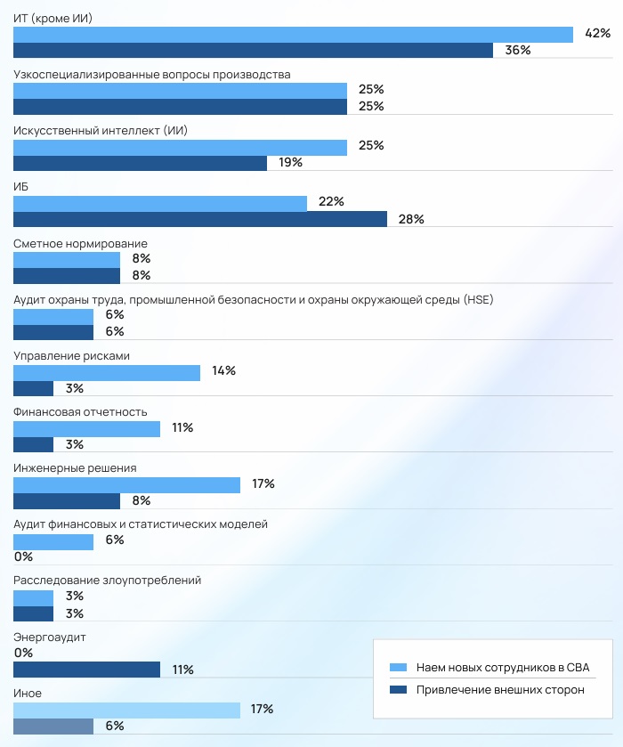 Компании, участвовавшие в опросе, наиболее активно ищут экспертизу для своих СВА (как для найма, так и для косорсинга) в следующих областях: ИТ, решение специфических производственных задач, ИИ, ИБ.