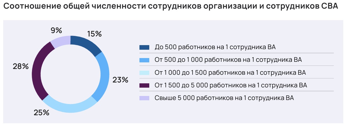 При этом почти треть респондентов (28%) указала, что на одного сотрудника СВА приходится 1 500 5 000 сотрудников организации, а две другие сопоставимые группы участников опроса (25% и 23%) указали соотношение от 1 000 до 1 500 и от 500 до 1 000 работников организации соответственно.