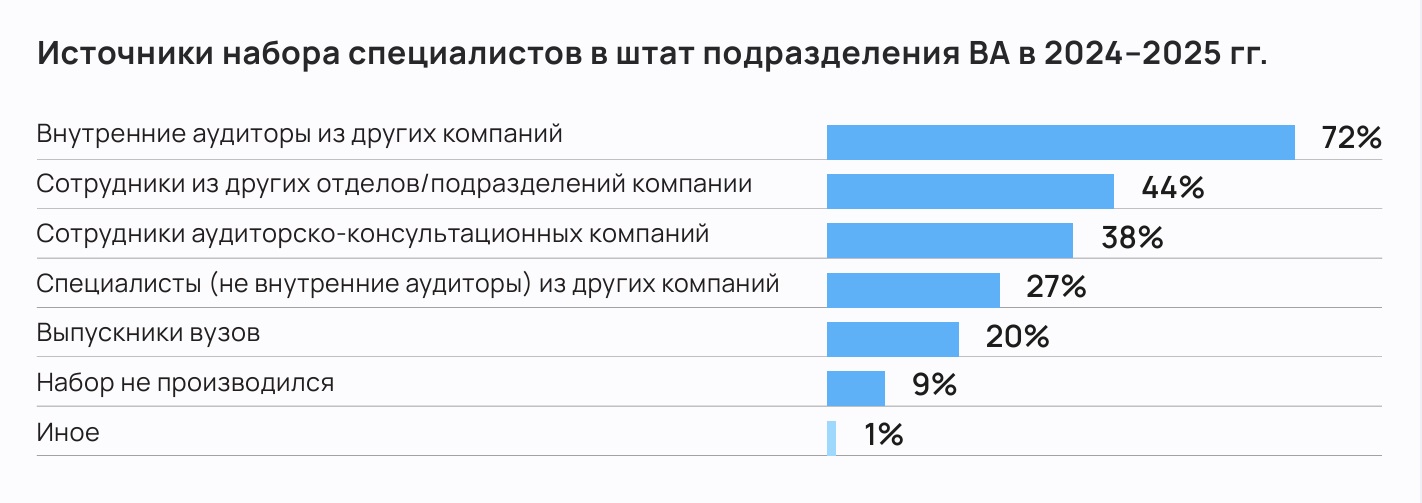 Для большинства компаний-респондентов основным источником набора специалистов в штат CВА является наем внутренних аудиторов из других компаний (72%). Также важными источниками набора специалистов являются: сотрудники из других отделов/подразделений компании (44%) и сотрудники аудиторско-консультационных компаний (38%).