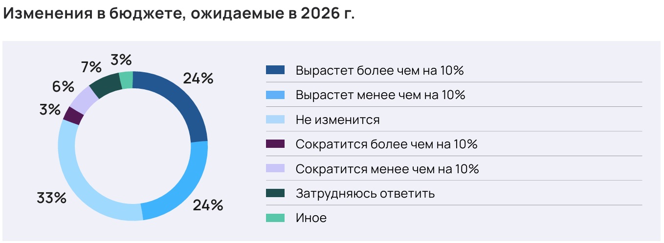 Почти половина участников опроса (48%) ожидают увеличения бюджета СВА в 2026 г., при этом каждый третий респондент не ожидает изменения бюджета. Рост бюджета СВА в большинстве случаев связан с ростом численности сотрудников СВА. С таким выводом не согласен