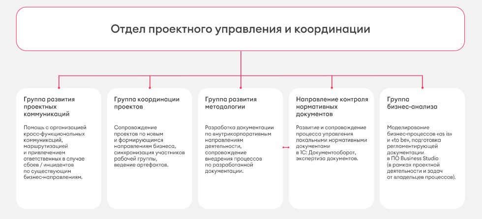 группа бизнес-анализа отвечает за формирование карты бизнес-процессов, поддержку проектов компании и подготовку регламентирующей документации в рамках проектной деятельности и задач от владельцев процессов.