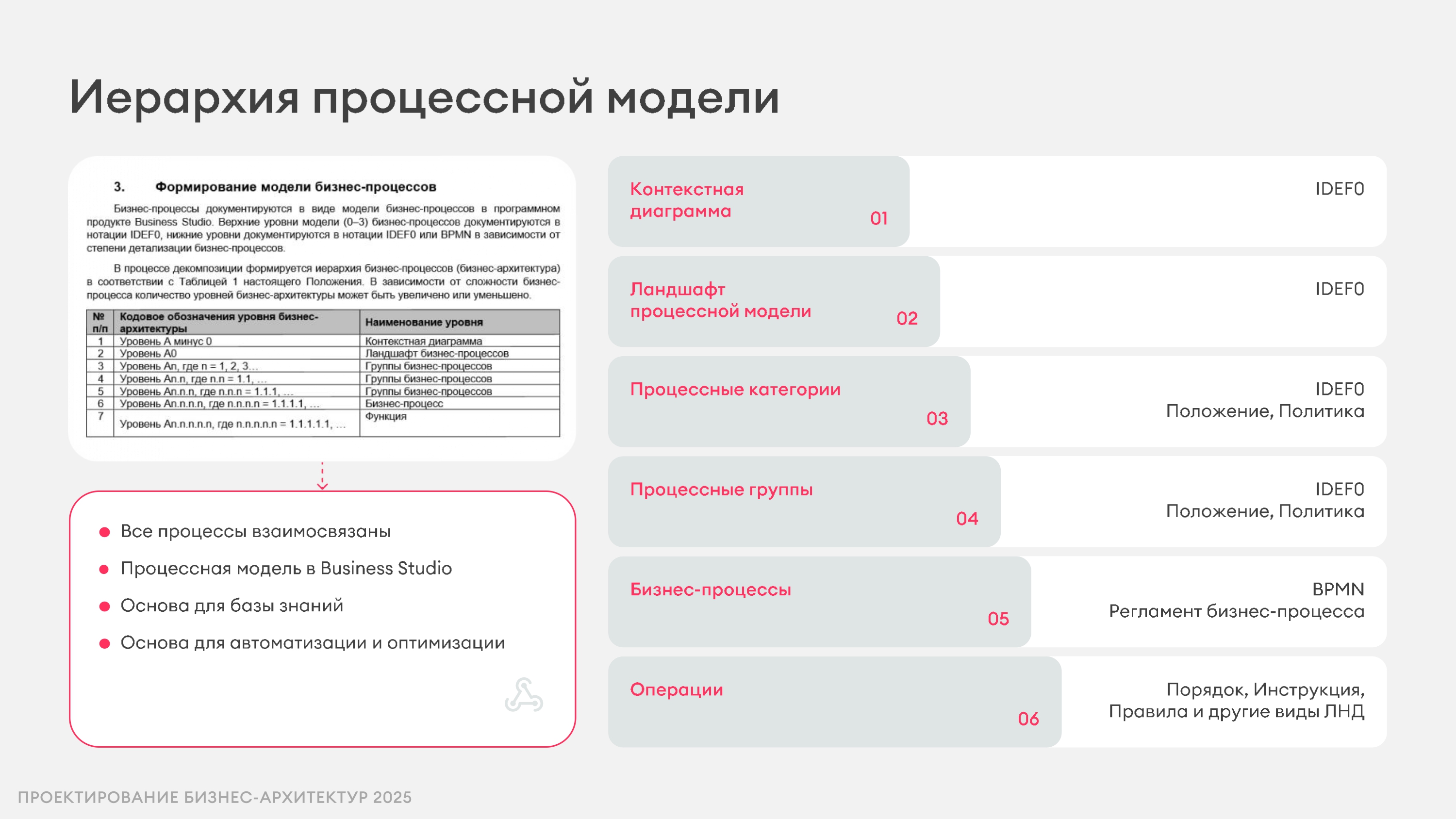 при описании бизнес-процессов мы опираемся на Положение о моделировании бизнес-процессов, в котором зафиксированы требования к формированию модели бизнес-процессов, разработке диаграмм, формированию документации, критериям оценки процессов;