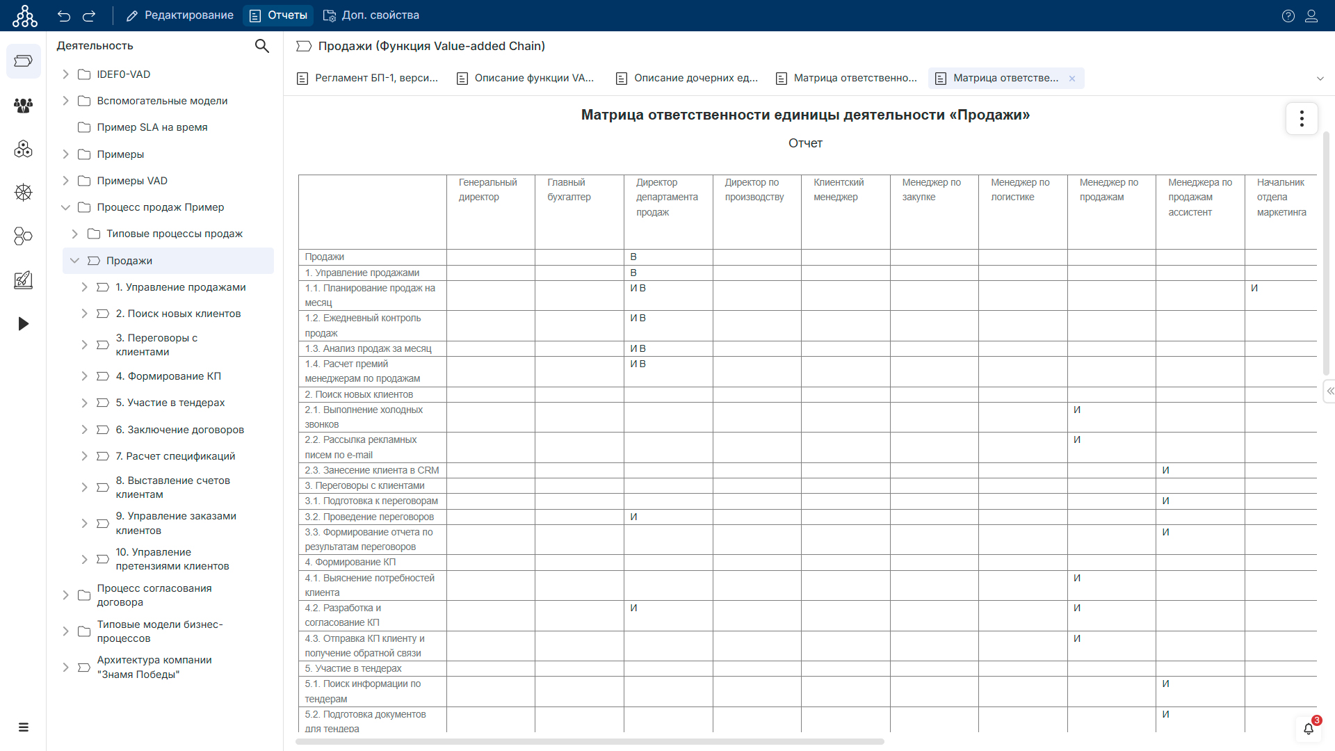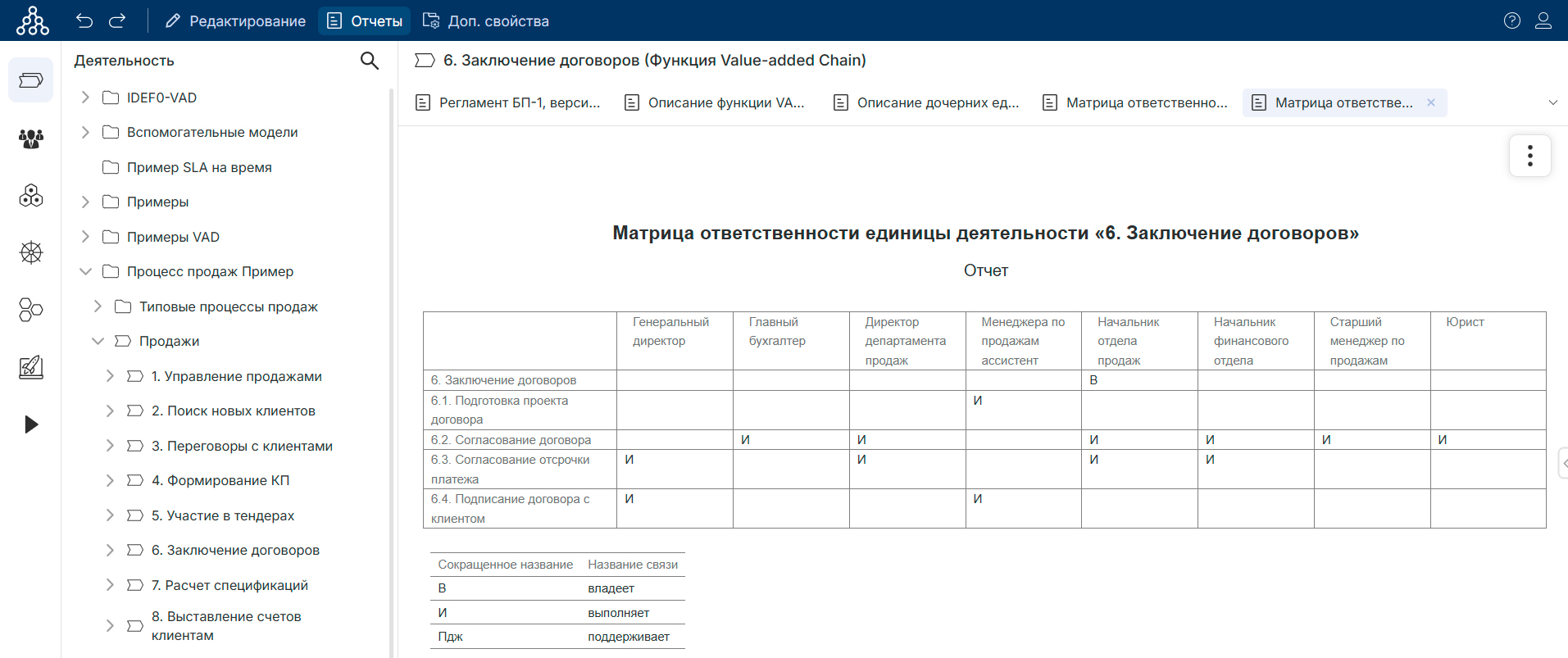 В программу была внесена информация о руководителях, ответственных за процессы и исполнителях процессов. В результате получилась матрица ответственности как для процесса продаж в целом, так и для любого подпроцесса.