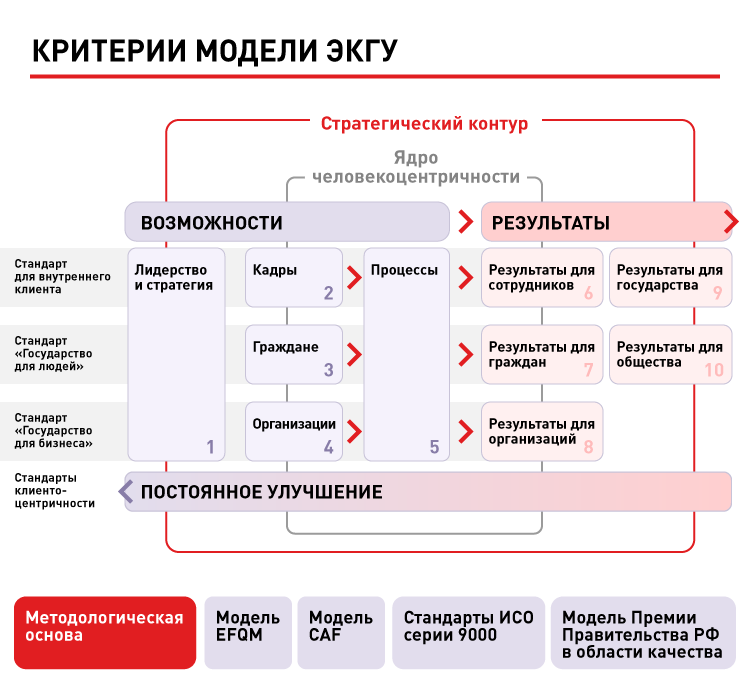 Методологическая основа ЭКГУ – модель совершенства EFQM , ставшая фундаментом для многих моделей организационной самооценки и премий по качеству, в том числе европейской системы оценки CAF для организаций публичного сектора и модели Премии Правительства Российской Федерации в области качества . Кроме того, методология ЭКГУ строится на принципах всеобщего управления качеством , закрепленных в международных стандартах на системы менеджмента качества ИСО серии 9000, а также принципах и стандартах клиентоцентричного государства, утвержденных Декларацией ценностей клиентоцентричности .