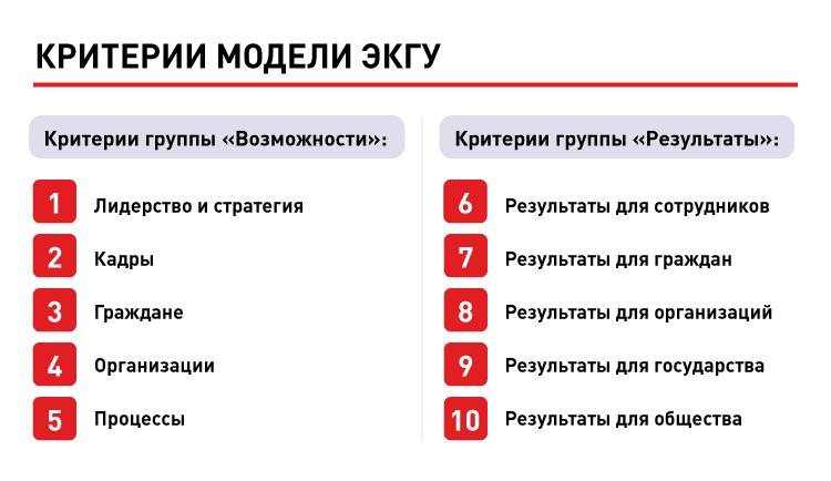 Критерии возможностей и результатов модели ЭКГУ взаимосвязаны. Стратегический контур модели соединяет возможности в области лидерства и стратегического управления (критерий 1) с полученными эффектами и воздействием через призму «Результатов для государства» (критерий 9) и «Результатов для общества» (критерий 10).