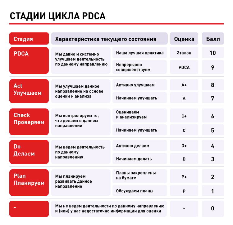 Оценка текущего состояния производится по десятибалльной шкале, в основе которой лежат стадии цикла PDCA:
