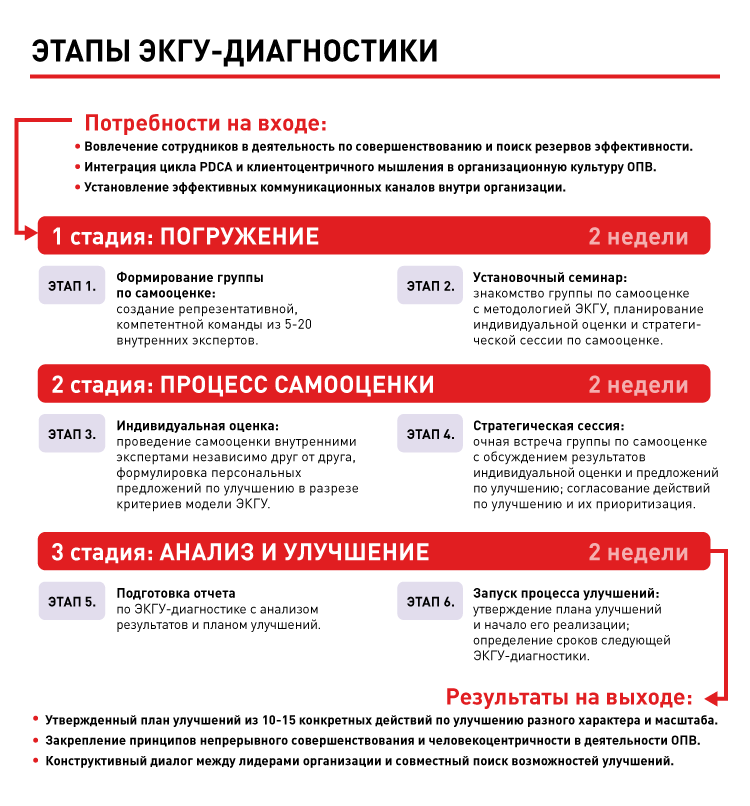 Орган публичной власти, освоивший инструменты ЭКГУ-мониторинга, может перейти на более продвинутый уровень применения модели – ЭКГУ-диагностику. Это формат классической организационной самооценки, выполняемой группой по самооценке с последовательным аналитическим разбором критериев модели и поиском возможностей улучшений.