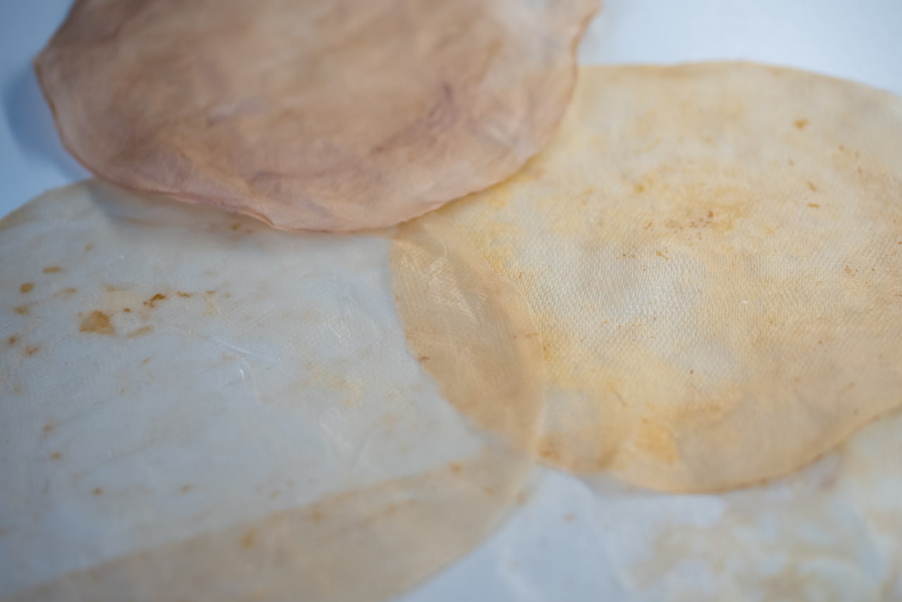 Чтобы материал стал гибким, его пропитывают соединениями на основе органических компонентов фосфолипидного происхождения. В результате вещества проникают в волокнистую матрицу мицелия, повышая эластичность и при этом не разрушая природную структуру материала. Эта обработка влияет прежде всего на тактильные качества: материал становится более мягким и пластичным. При этом практически не сказывается на массе: прибавка составляет порядка 0,1 грамма на образец.
